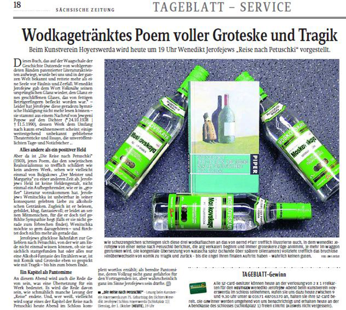Ein Abend mit Uwe Jordan, Redakteur der Sächsischen Zeitung, Hoyerswerdaer Tageblatt, zu Wenedikt Jerofejews Poem: Die Reise nach Petuschki